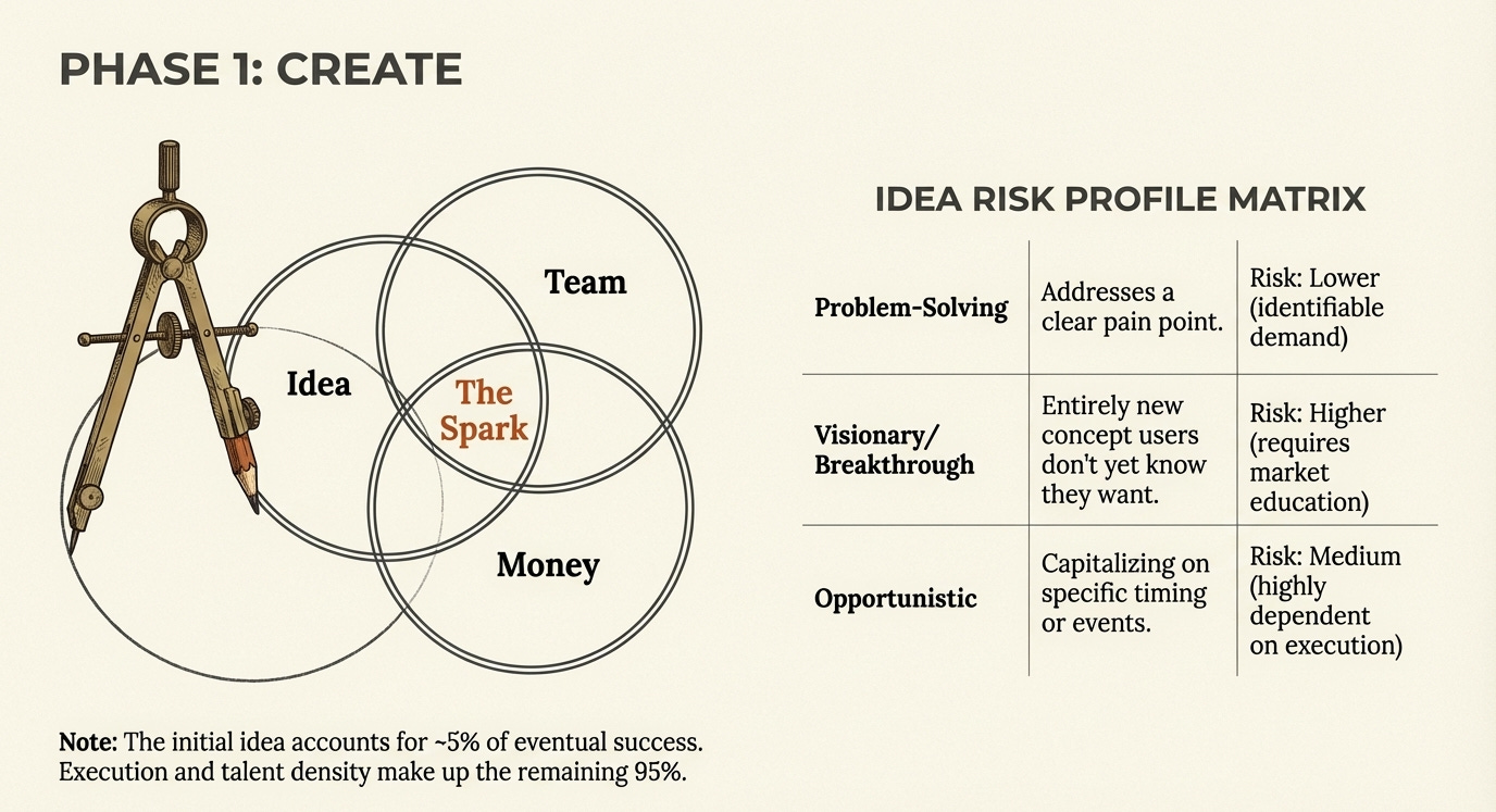 Why? Because execution is everything. You should treat your initial idea simply as a “hypothesis,” a guess that you are going to test in the real world. In the Create phase, your focus shouldn’t be on protecting a “perfect” idea, but rather on finding a real problem to solve, securing initial funding, and putting together a solid founding team to execute the vision.