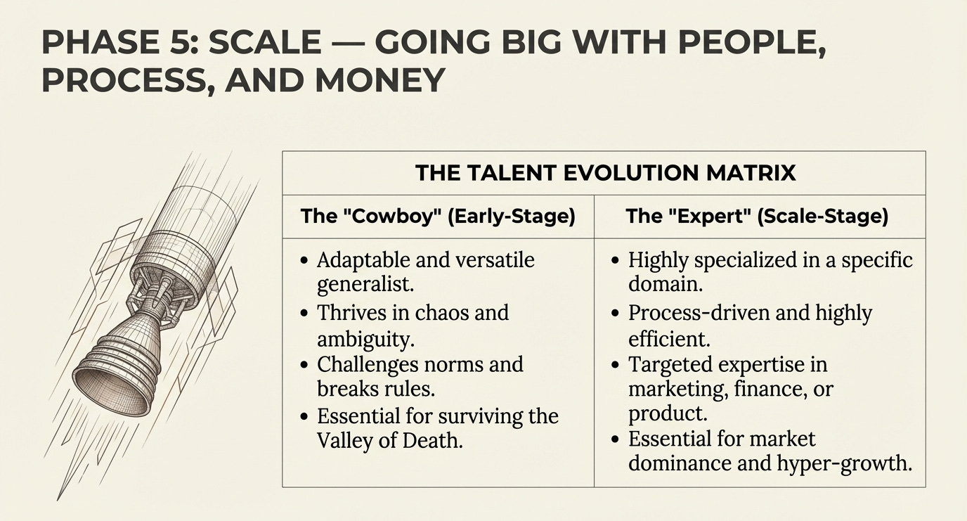 Scaling means massively increasing your operations. During this phase, your focus shifts to three things: people, processes, and money. You will likely need to raise serious venture capital to fund this expansion. You will also need to change how your team operates. In the early days, you needed “generalists” who could do a bit of everything; now, you need to hire experienced “specialists” to handle specific departments. You have to build systems and rules because you can no longer manage every single detail yourself.
