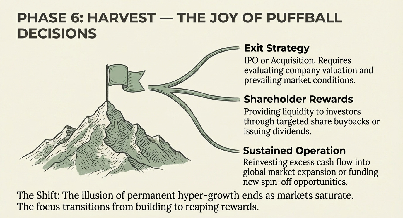 You are generating cash and making what he calls “puffball decisions”—decisions that are generally favorable no matter which option you choose. During this phase, you get to decide how to reward yourself and your investors. Will you take the company public (IPO)? Will you sell it to a larger corporation? Or will you keep running it and enjoy the long-term wealth of compound growth?.