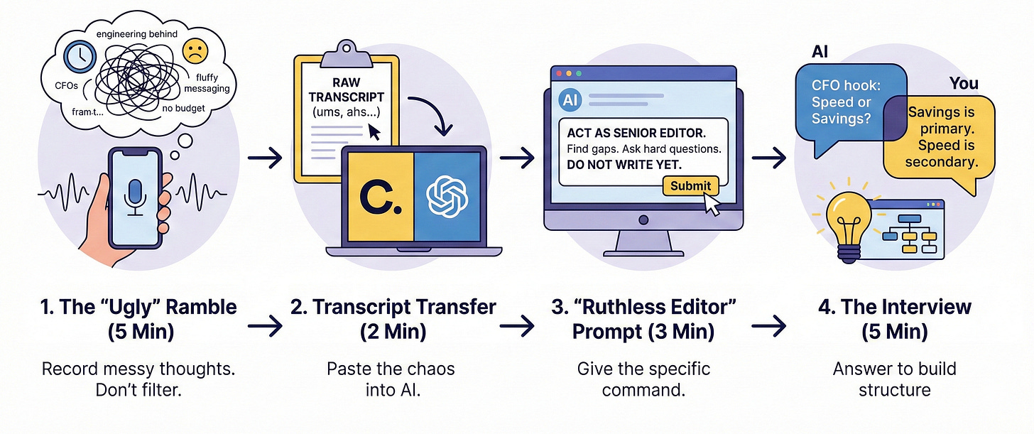 Step 4: The Interview (5 Minutes) The AI will come back with questions like: “You mentioned targeting CFOs, but your notes focus on ‘speed of implementation.’ Do CFOs actually care about speed, or do they care about cost savings? Which is the primary hook?”